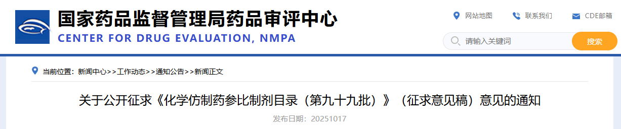根据国家局2019年3月28日发布的《关于发布化学仿制药参比制剂遴选与确定程序的公告》(2019年第25号)《国家药监局关于发布化学仿制药参比制剂调整程序的公告》(2023年第35号),我中心组织遴选了第九十九批参比制剂(见附件),同时对参比制剂拟调整品规进行了审议,现予以公示征求意见。
