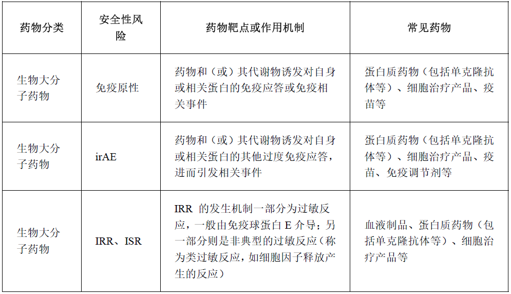 生物大分子药物(包括单克隆抗体和其他治疗性蛋白制剂等)与生物大分子药物的主要区别在于分子大小、结构复杂性和生产方式。生物大分子药物本身具有生物活性,因此其毒性作用通常与药效相关,且脱靶效应较为少见。生物大分子药物常见的AE有免疫原性、免疫相关不良事件(immune-related adverse event,irAE)、输液相关反应(infusion related reaction,IRR)、注射部位反应(injection site reactions,ISR)及其他。常见心脏毒性(QT间期延长、心律失常、心肌和心脏瓣膜损伤、血压影响)、肝脏毒性、肾脏毒性。相关作用机制及常见药物见下表: