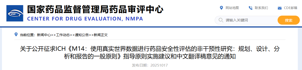 为推动ICH指导原则在国内平稳落地实施,我中心拟定了《M14:使用真实世界数据进行药品安全性评估的非干预性研究:规划、设计、分析和报告的一般原则》指导原则实施建议和中文翻译稿,现公开征求意见,为期1个月。如有修改意见,请反馈至联系人电子邮箱:gkzhqyj@cde.org.cn。